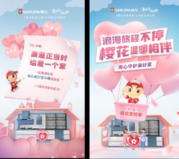 在刚刚过去的婚恋黄金周期,在配合着樱花盛放季节营造出来的甜蜜恋爱氛围下,SAKURA樱花携手《喜欢你我也是3》,将目光锁定年轻恋爱人群,瞄准婚恋市场这一潜在年轻主力军,通过优质IP+创新活动和心中有爱的年轻人群发起“对话”,在传递“有温度的国民厨卫品牌”这一品牌认知的同时,更是开启了品牌年轻化进阶的浪漫新篇章。