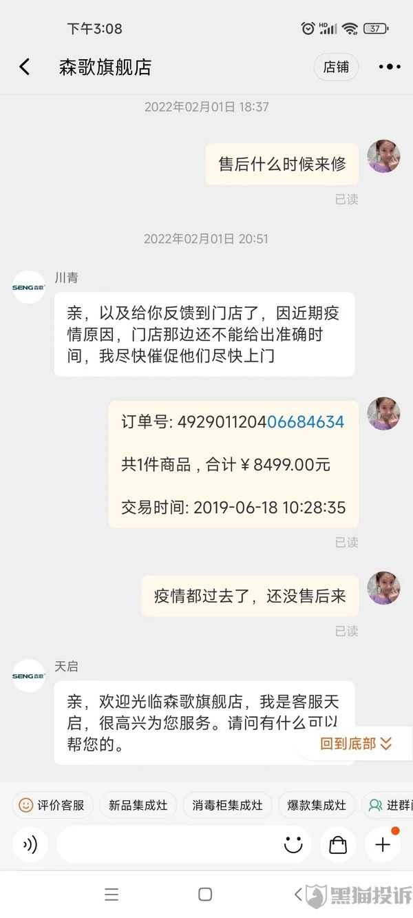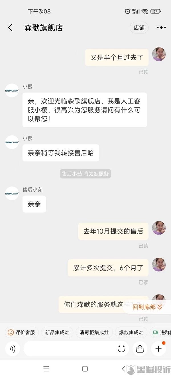 据黑猫投诉平台显示,6月7日,网友天宗200108投诉,森歌“服务不到位,三包问题,售后不处理”,据聊天记录显示,报修半年之久,森歌仍无法安排售后服务。