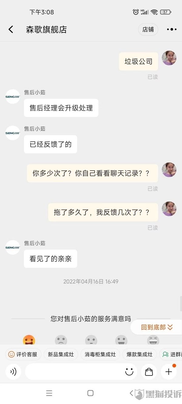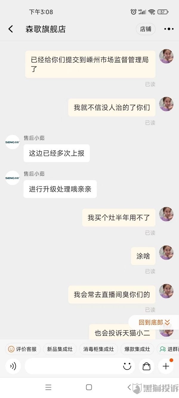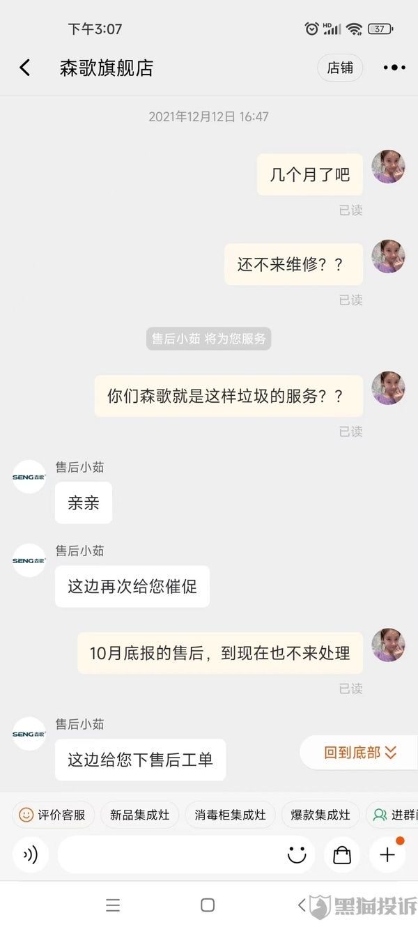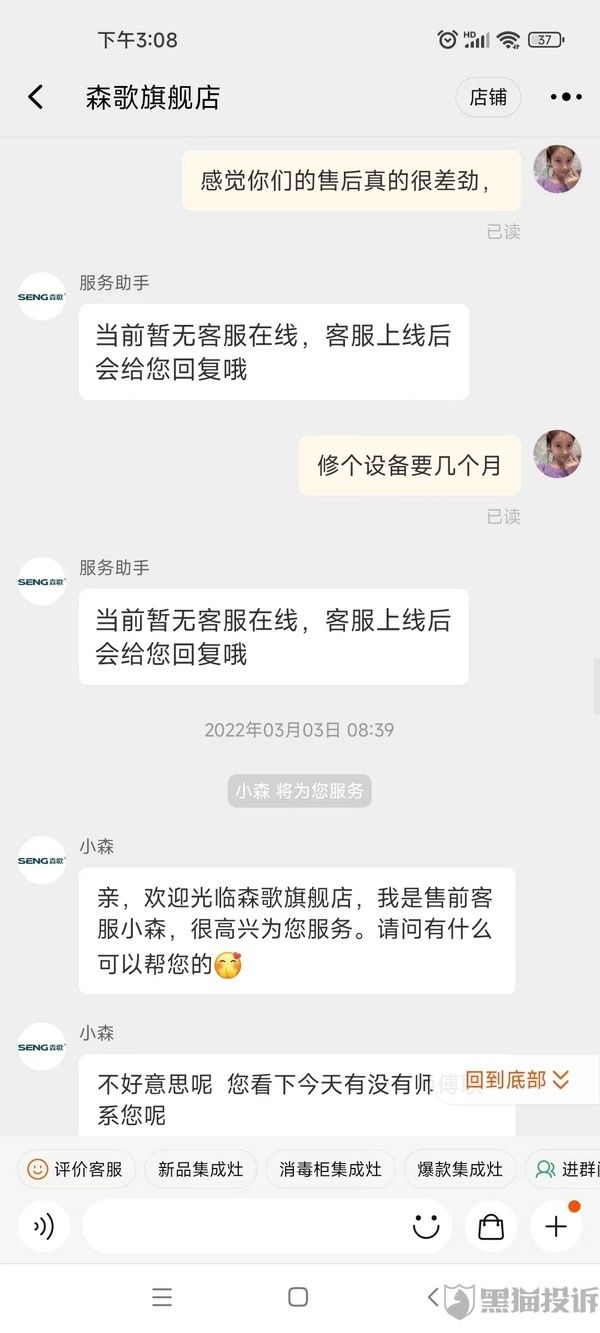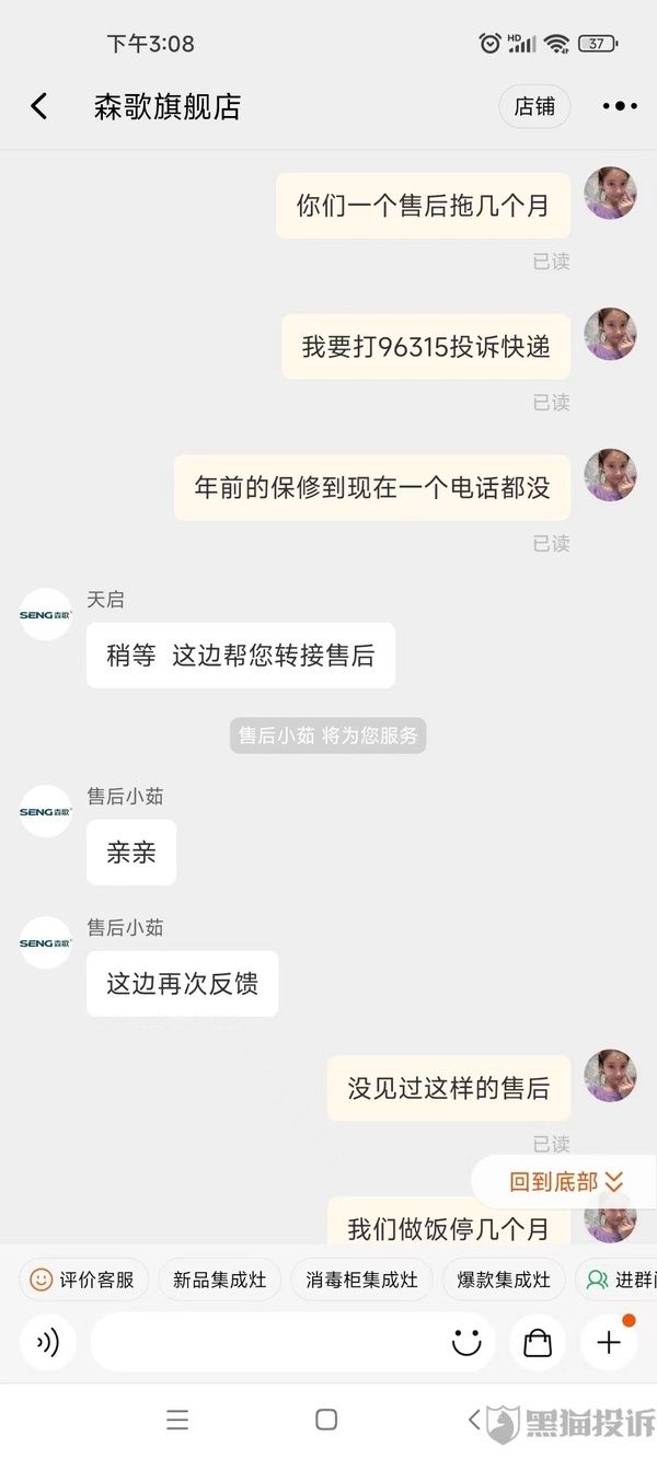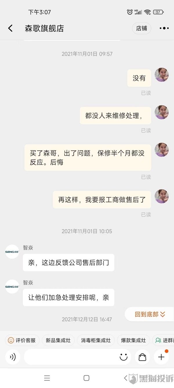 网友投诉森歌集成灶售后堪忧,报修半年之久,仍无法安排报修服务
