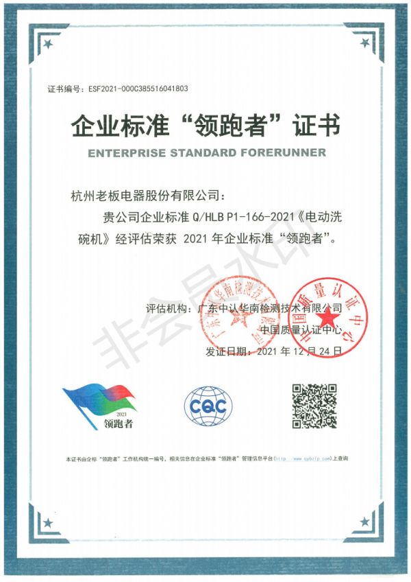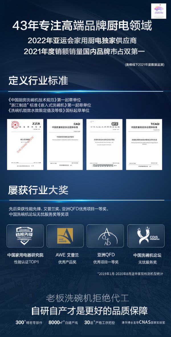 老板电器对产品质量向来精益求精,为弥补国内洗碗机行业标准缺失,老板电器充分发挥高端厨电品牌的引领示范作用,先后参与了《洗碗机能效水效限定值及等级》、《嵌入式洗碗机》等文件内容的起草制定。坚持不懈的高标准严要求成就老板电器过硬的产品质量,也让其斩获如艾普兰奖、亚洲QFD优秀项目一等奖等国内外多项大奖,成为洗碗机行业的标杆。