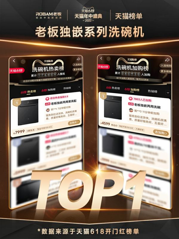 在获得行业众多荣誉的同时,老板电器洗碗机更收获广大消费者的青睐与认可。以今年618战报数据为例,老板洗碗机在天猫旗舰店与京东自营店重点发力,全渠道整合资源共同迎战618大促,实现全渠道产品同比增长超400%。本次大促期间,老板2022年新品洗碗机销量占比超45%,以创新智能化产品,获得年轻消费者的热捧,并以此奠定了老板洗碗机在同品类市场的优势地位。