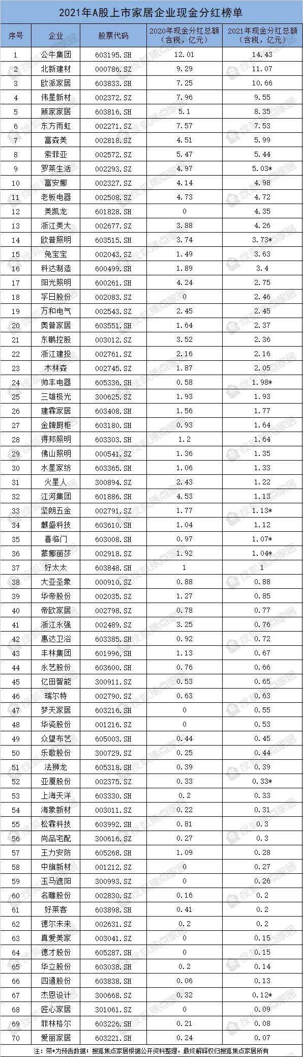 截至2022年6月22日,搜狐焦点家居根据公开资料,整理了70家A股上市家居企业年报披露的现金分红计划,总体而言,合计超140亿元,过半企业现金分红总额过亿;2021年每股股利普遍上涨,火星人、东鹏控股等下降;受疫情、原材料上涨等影响,近20家上市家居企业取消分红。