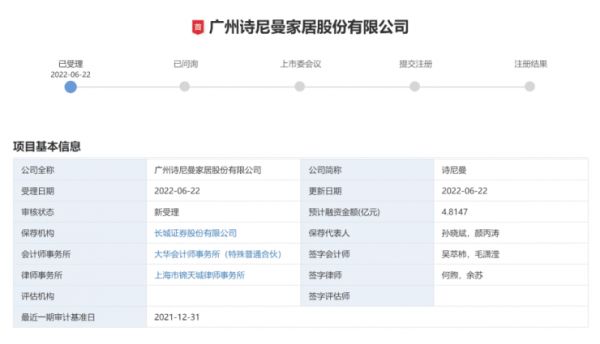 2022年6月23日,广州诗尼曼家居股份有限公司披露招股说明书(申报稿),从深圳证券交易所获悉,诗尼曼IPO申请目前已受理,其募集资金用于项目及拟投入的募资金额为:5000万元为补充流动资金,4亿元拟投向湖北荆门产能建设项目二期,3147.08万元投向信息化升级建设技术改造项目。