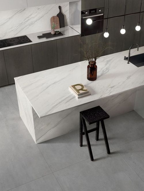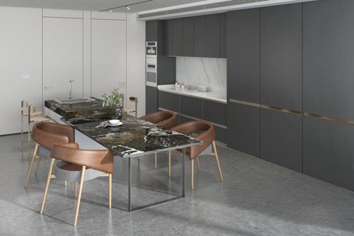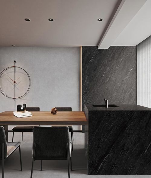 艾蔻岩界系列具有强劲可塑性及物理性,抗折抗压,防渗防污,防滑耐磨,绿色环保等优越性能,应用于简约岛台设计,不仅可以充当餐桌的角色,同时还能节省空间、随意移动。
