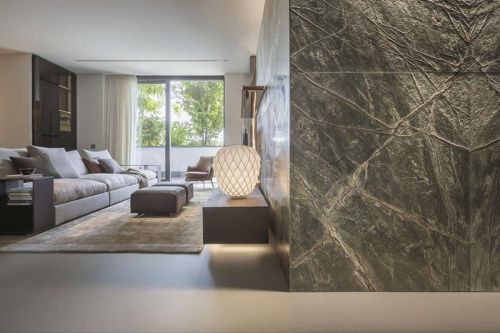 它没有抢眼的花纹、没有格状的接缝,以浑然一体的完整平面存在于空间于时间中,表达着超越风格、超越审美的美学,与金属饰面、镜面等极富现代感的材料相互配合,却不显得空间过于拥挤。