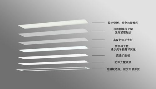 宜美照明优选7种材料,采用科学设计,从根源解决健康照明问题。在灯具底层,使用了导热背板,可避免热量堆积,减少安全隐患;背板上,珍珠棉能确保光学元件紧密贴合,防止光线漏出;然后是高反射率反光纸,可在增加光源利用率的同时,减少眩光的产生;在LED灯珠下,使用优质导光板,可减少光学损耗和黄化;在导光板下,还采用高透扩散板和防眩光棱镜层,可有效减少眩光的形成;灯具外还采用高强度边框,可减少吊装变形,延长使用寿命。