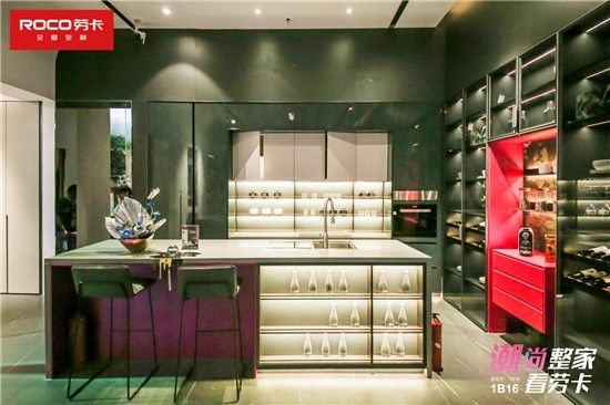 在劳卡【Z潮代】新品中,“色”即美学:“奇幻丛林”花色营造神秘氛围;“雾影黛青”花色如昼夜光影;“元阳红”花色象征灵动与活力,为“潮尚”提供视觉内涵,为产品赋予青春、时尚的情绪形态。“形”即姿态:钻石造型的变色吸塑门板、一体化的钻石造型拉手、彩虹玻璃酒柜等,则成为构造空间的点睛之笔,实现空间与功能的灵动。“用”即功能:潮玩收纳、手办收纳、球鞋收纳……,个性化收纳功能结合“自带光环”的层板营造灯光氛围,更贴合年轻一代的消费者的生活方式。“意”即一体:木门、护墙、柜类产品及配套家具,做到色系、风格、造型的和谐统一,让“潮尚整家”实现从产品解决到空间解决的飞跃。