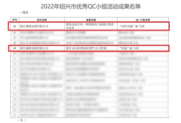 日前,绍兴市标准化研究院与绍兴市质量协会联合发布了《关于公布2022年绍兴市优秀QC小组活动成果名单的通知》,森歌在数百QC小组中及项目中脱颖而出!“炽焱”QC小组的“提升A8系列集成灶燃气火力性能”活动成果荣获一等奖!“协作共赢”QC小组的“降低总装车间一体烤箱内门玻璃白雾状不良率”活动成果荣获一等奖!