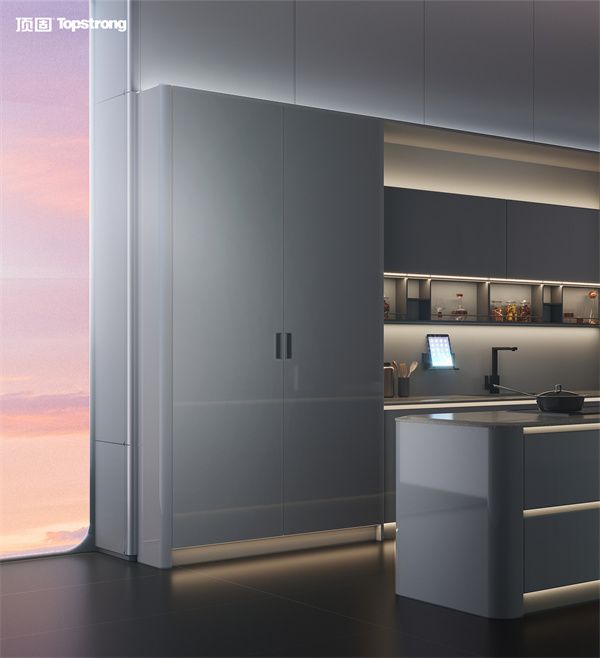 该系列融入了工业、智能、潮流的元素,同时融入了大量玻璃、碳纤、皮革面料等特殊材质,糅合了中国文化中“方圆”的思想,在墙板、柜体阳角处采用圆弧设计,让原本刚硬的金属视觉和触感更显柔和,兼顾使用安全性的同时,更兼顾着家居生活里应有的温度。
