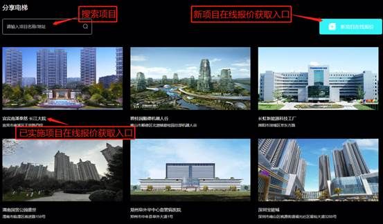 首先,输入意向接入项目名称或项目地址(输入省或市名称亦可),查找目前已部署旺龙云电梯的项目,点击进入填写项目需求参数等信息,自助完成询盘报价;如意向接入的项目暂未显示,则可选择“新项目在线报价”,提交项目需求信息,待双方进一步沟通确定乘梯方案及报价等。