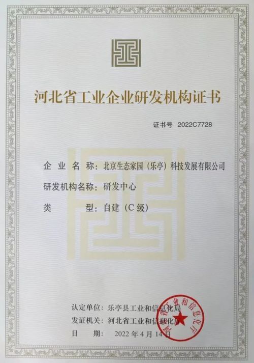 北京生态家园(乐亭)科技发展有限公司 荣获 “河北省工业企业研发机构证书”