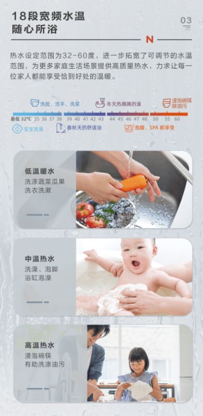 针对全屋用水需求多样化情况,能率E5热水器拥有宽广温域设计,配备磷脱氧铜热交换器,轻松实现32℃-60℃宽频水温,一机满足家庭多样用水需求。为有老人与小孩的家庭日常生活中避免误触操作,能率E5热水器采用更简单的人性化操作系统,搭配综合安防,保障全家人的洗浴安全。