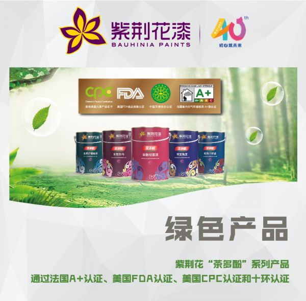 紫荆花茶多酚墙面漆系列,从天然茶叶中获取灵感,萃取天然茶多酚因子,将绿色基因融入生活,给家带来大自然般的纯净空气。茶多酚全系列产品在研发、采购和生产过程中,严格把关各项标准和细节,通过法国室内空气环境检测A+级认证、美国FDA食品接触认证、美国儿童产品证书和中国环境标志认证。