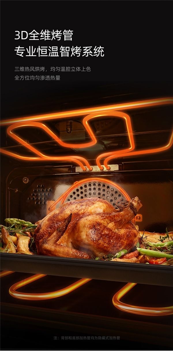 在烤制美食时,华帝蒸烤一体机F10搭载了由上、下两层加热管和循环风扇共同组成了3D热风循环系统,热力能够迅速包裹食材,让烘烤更加均匀、彻底、迅速。