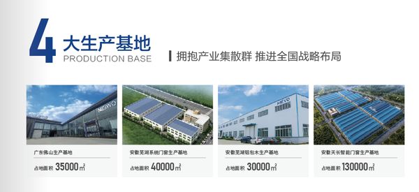 美沃门窗在全国拥有四大生产基地即广东佛山生产基地、安徽芜湖铝包木生产基地、安徽芜湖系统门窗生产基地、安徽天长智能门窗生产基地,并分别在广东佛山、安徽芜湖设立两大营销中心,生产销售辐射全国。