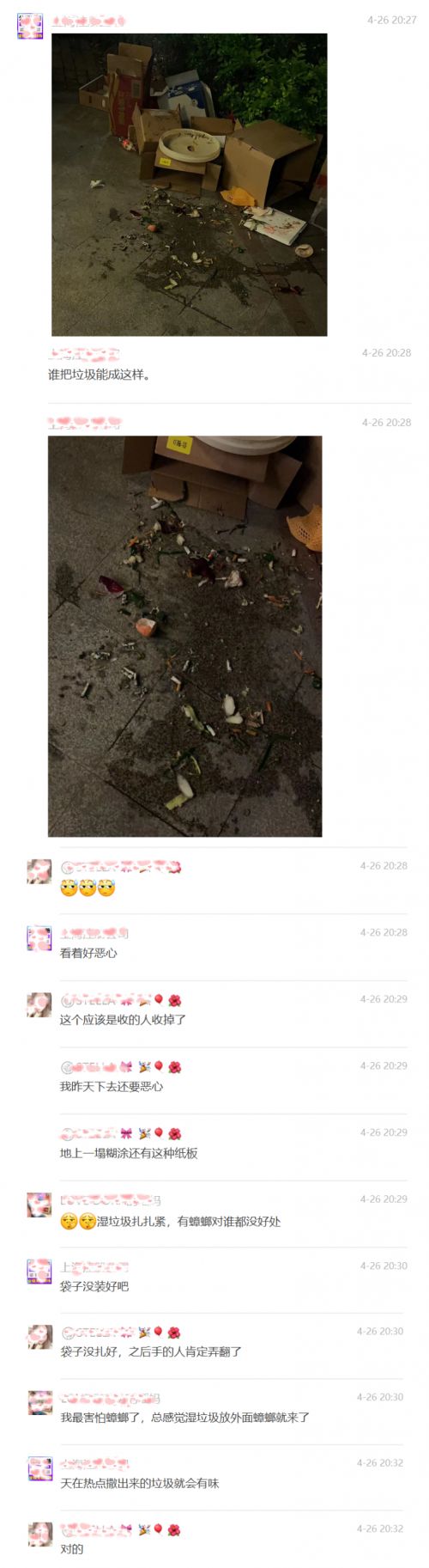 现在不用把垃圾丢到垃圾分类站了,就直接放在楼栋下,志愿者会及时清理。但是经常有垃圾袋破裂、垃圾散漏、液体渗出的现象,很难清理,给志愿者造成了很大负担,地面上的残渣和液体很快就吸引了苍蝇蚊虫,还有蟑螂,发出一股难闻的臭味,楼栋住户也都难以忍受,抱怨声四起。