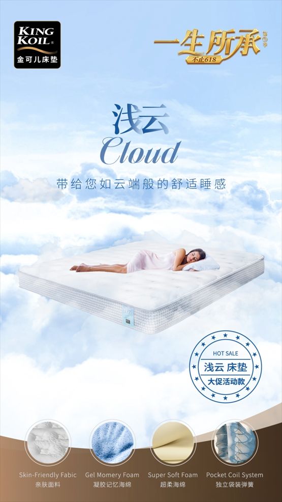 与深坑系列不同的是,另一款大促活动款浅云,更让人感觉仿佛睡在柔软云端的舒适感。经过多重测试的亲肤面料和超柔海绵,在独立袋装弹簧的支撑下,感受一种独特的柔软的力量。浅云所采用的凝胶记忆棉,是在制作过程中混入成分稳定的硅酸颗粒,吸附性强,可以吸收人体散发的多余热量,保证睡眠的清爽,缓解人体压力。