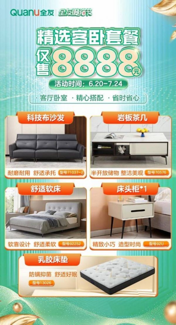 除上述的花样套餐外,“全友懒猫节”期间还有多个软体爆款单品特惠,精品床垫799元、1.8米科技布软床1289元,进口真皮沙发5288元……来全友懒猫节,打包买软体,价格更实惠,更多惊喜,持续呈现!选择全友,让你的生活赢在起跑线!
