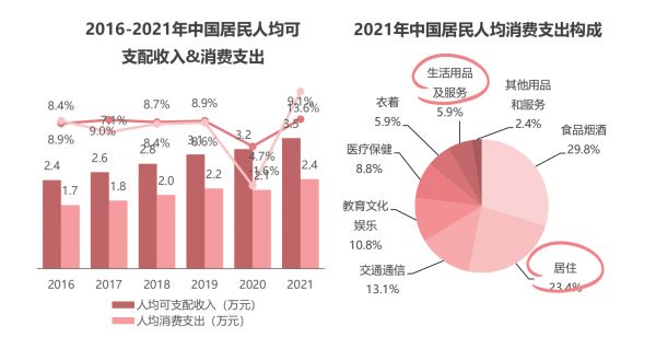 有了政策的正向引导与市场释放出的强烈信号,数字家庭进程的推动无疑有了先天的条件,但如果消费领域萧条的话,势必也会大打折扣。《白皮书》的调查数据显示,虽受近几年受疫情等因素影响,但我国居民消费能力和消费水平持续增长的趋势并没有发生变化。2021年数据显示,我国国民人均可支配收入达3.5万元,人均消费支出达2.4万元;其中居住、交通通信、教育文化娱乐、医疗保健等方面的消费成为主流;人民生活已从解决物质文化基本需求上升到追求美好生活的阶段,传统的“可以动手解决就不要花钱”的理念逐渐被“用科技来完成无意义劳动”所取代,数字家庭已经成为消费升级的重要方向。