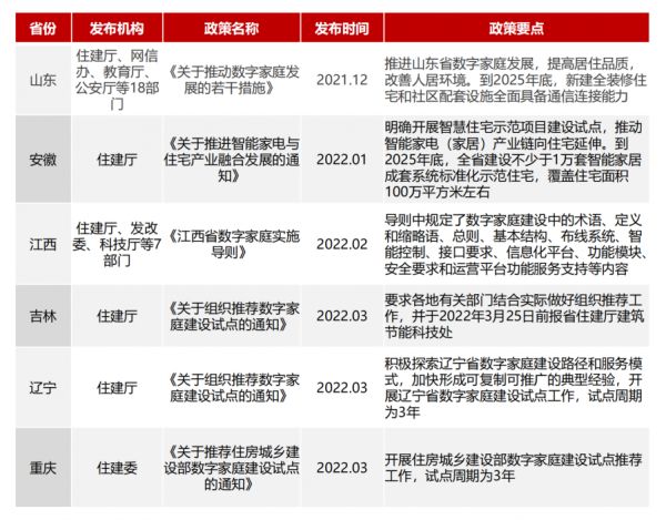 本次《白皮书》的发布,也进一步佐证了何宝宏的观点,首先从宏观上来看,去年4月国家住建部等16部门联合印发的《关于加快发展数字家庭 提高居住品质的指导意见》可以说为数字化家庭建设提供了充分且良好的政策指导环境,同时《意见》也明确了到2022年底,基础条件好的省(区、市)至少有一个城市或市辖区开展数字家庭建设,达到基本形成可复制可推广的经验和生活服务模式的程度,而到2025年底则要完成构建比较完备的数字家庭标准体系,同时对于新建住宅及社区提出了,要实现具备通信连接能力,拥有必要的智能产的要求;而对既有住宅及社区则要求拥有一定的智能产品,数字化改造初见成效,形成有序发展的数字家庭产业生态;同时在健康、教育、娱乐、医疗等数字家庭生活服务系统较为完善。从一系列的政策中不难发现,对于数字家庭的建设,不仅限于技术的升级、不仅限于家庭单位,而是在社会层面实现互联互通。在《指导意见》的基础之上,各省份也在逐步推进具体政策落地,其中山东、安徽、江西、吉林、辽宁、重庆等多个省份和城市都陆续出台了数字家庭配套政策,多地都积极显露出抓住国家数字家庭建设的战略机遇,提升相关产业实力的强烈意愿。