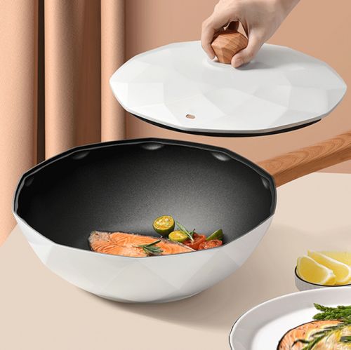 首先来看看WEM雅嘉隆多功能不粘微压炒锅的外形,锅体采用独特的多边棱形设计,并且贴心的选用白色锅盖搭配,优雅又显气质,给厨房整体色调增加几分高级艺术感。同时还有经典圆形锅体设计,配合低调的灰黑色锅盖,独特的材料质感,低调又彰显内涵。