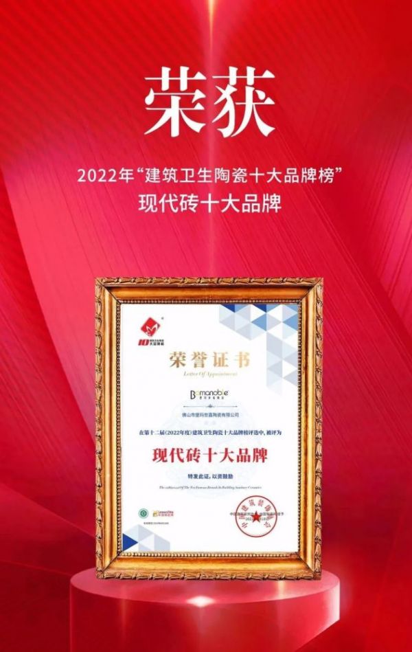 荣耀喜讯 | 堡玛世嘉陶瓷荣获“2022年度建筑卫生陶瓷•现代砖十大品牌”