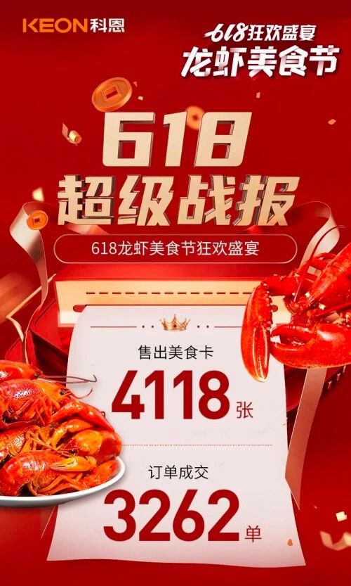 科恩龙虾美食节,618狂欢盛宴于5月28日-6月18日正式火爆开启,吃喝玩乐购,看直播,中大奖,千城千店,共襄盛举,海量壕礼抽抽抽,万元大礼送送送,科恩宠你,不讲道理!本次极具创意的科恩龙虾美食节主题活动受到了全网追捧,用户反响热烈,门店的创意龙虾布置也成为了当地独特网红IP,其吃喝玩乐购一站式钜惠活动不仅增强了品牌与消费者之间的认知交流,提升了消费者的社交、使用体验感,更吸引了众多主流媒体争相报道,开启了厨电行业双线IP互联新时代!