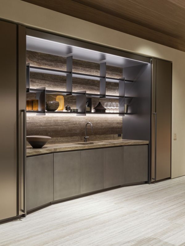 它们是建筑的一部分,和家具自有空间融合,产生了新型组合可能,可以围绕壁炉等既有元素搭建,或者提供吧台、居家办公室等新型集成功能。就这样,家具系统和建筑墙面和谐共生。结构性家具和移动性家具实现了对话,成为起居场所内部的独立物品。