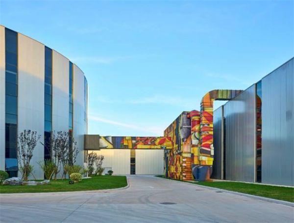 园区风格上也采用了更艺术、明快的方式。园区内设计有一条醒目、潮流感十足的装置艺术廊,TA既是一条功能廊道,也是装置艺术作品,通过立体绘画艺术的镶嵌点缀,精准诠释装置艺术作为环境艺术,即“场地+材料+情感”的综合展示艺术所传递的沉浸式体验感。在科技的运用和对未来的诠释上,美克家居以科技智能与设计艺术赋能,以未来主义风格的设计形式化解了工业机器的冰冷和粗糙,以“现代感”为创作基准,诠释了艺术与工业融合的全新时代。
