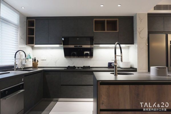 在这个参评作品里,我们的厨房空间是一个开放式厨房,做了中厨和西厨区的设计。我们配备了AEG侧吸式吸油烟机和灶具。这款吸油烟机专为中国厨房烹饪习惯设计,吸烟力表现出色。而且,它搭载了HobHood烟灶联动系统,实时监测油烟和温度大小并调控风速。此外,它还有Breeze Circulation微风循环模式,吸油烟机有个内置的过滤器,可以高效吸排油烟,让家中的厨房环境空气保持清新。