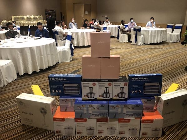 星迈黎亚仰光商贸城家电产品采购对接会现场,图中产品为中国厂商发往缅甸市场部分样品