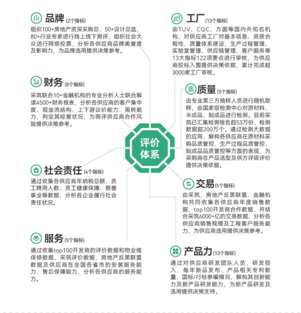 采筑将SCI评价内容与万科30多年供应链管理经验,以及行业权威机构的供应链管理成果充分结合,输出2021《采筑建材行业指南》,为行业提供一份客观公正,能快速摸清产品力风向,全方位了解供应商实力的供采合作指导工具书,辅助采购商客户准确、快速决策,佐证供应商综合实力。