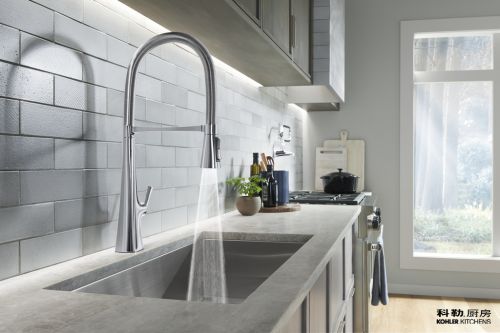 厨房中蔬果厨具和厨盆的清洁是龙头第一大重任,面对多种清洁任务,科勒厨房这款酷思专业厨房龙头有气泡水流,强力水帘和轻柔薄雾三种水型自由切换,轻松应对厨房清洁难题,助你悦享优雅厨趣。