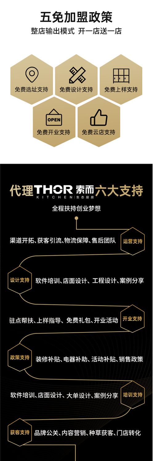 作为对东西方现代家庭生活方式的探究沉淀上百年的家居品牌,THOR索而于上世纪30年代创立于美国,于2020年正式回归国内市场,并将生态厨房理念引入国内。在消费者眼中,索而不仅完美诠释了厨房与家庭关系,同时在厨电一体化的打造上以及整家定制领域更是独树一帜;在经销商的眼中,加盟索而有着众多优势,是他们掘金千亿蓝海市场的有力保障。