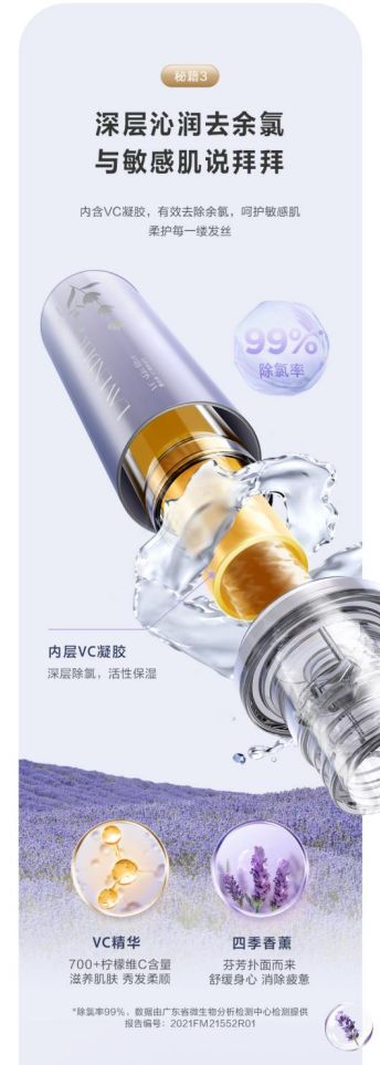 美的氧克美肤恒温花洒内含VC凝胶,能有效去除余氯物质,除氯率可达99%,更好的呵护你的敏感肌肤。 此外,它还配备了VC精华,700+柠檬维C含量,让你的肌肤保持水润光泽,让秀发更加丝滑柔润。而且四季香薰,能够舒缓身心,消除你满身的疲惫。