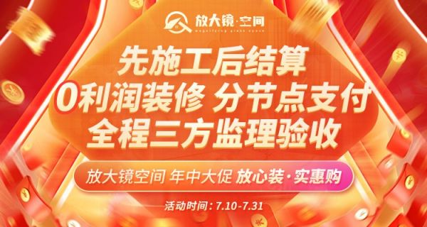 为减轻业主装修压力,让更多人可以住进梦寐以求的家,放大镜空间年中大促火热来袭,平台千万补贴,装修0利润。索菲亚、TATA、⻢可波罗、公⽜等⼤牌建材至高省5万,Plus会员再送万元装修⾦。全城仅限100名业主,名额有限。