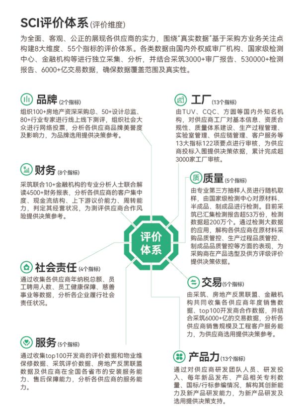 2021年8月,采筑联合100+开发商、50+设计院、10+金融机构、3家第三方审厂机构、12家国家级检测中心、建筑单位、行业专家等成立SCI共建联盟,依靠“真实”“数据”推出供应商综合指数SCI,并通过SCI测评结果,创建建材行业供应商白名单,解决行业低价中标、寻源难、评价难、交易成本高等痛点问题。