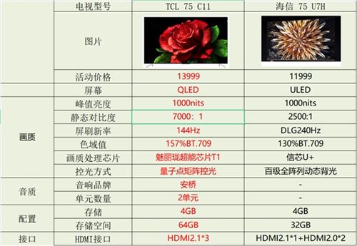 在配置及接口上,TCL C11采用魅丽珑超能芯片T1,CPU采用4核A73架构,拥有4GB+64GB超大运行内存和储存空间,各式APP随意下载,其更是拥有三路HDMI2.1接口。海信U7H在内存方面就差了点,同样的4核A73架构,4GB运行内存,但是只有32GB储存空间,且只有一路HDMI2.1和两路HDMI2.0。综合来说,海信U7H传输速率显然没有TCL C11好,给予用户的观影、游戏体验,也没有TCL C11强!