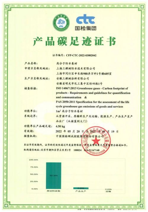 三棵树防水传递“健康、自然、绿色”的品牌理念,现旗下两家工厂全体系产品已全部通过中国国检认证获得产品碳足迹证书。产品碳足迹证书从摇篮到大门:资源开采、原材料生产及运输、能源生产、产品生产至产品出厂对产品的碳排放量做了认证,亦是产品进入新兴绿色市场的通行证。就建筑与建材领域而言,产品碳足迹证书是当前绿色建材产品认证的基础考核指标,亦是国际市场上建筑工程可持续性评估的重要内容,在国际绿色建筑评价体系中发挥着日益重要的作用。