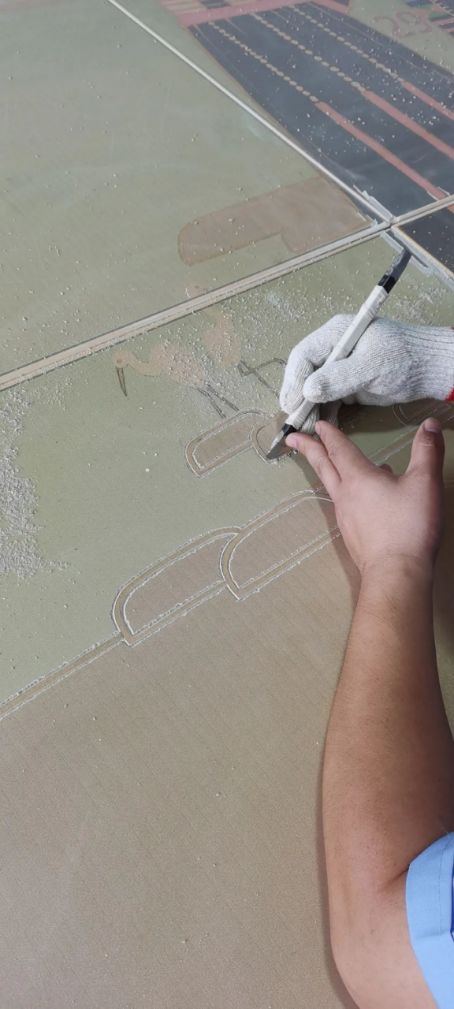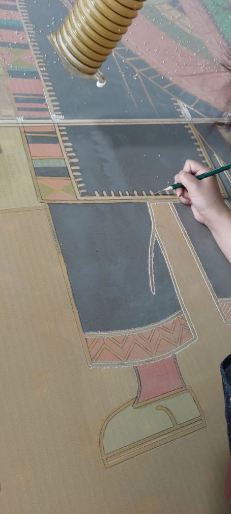 作品生产过程中,因原稿尺寸较小,放大后还要对一些细节进行再次深化。工艺师们用铅笔在砖坯上二次创作,丰富内容,然后进行雕刻,保障作品的艺术表现力。
