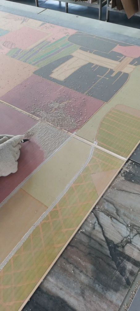 为此,马可波罗文化陶瓷特别定制了一款600×1200mm 的黄色面釉砖作为作品平面的底色,既符合原作的色系,又丰富了颜色的层次,让作品既有平面釉色,又有雕刻后绘制的其他颜色。