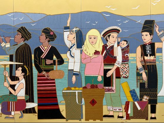 本幅作品色彩丰富,原稿针对主画面人物身上穿着的各式民族服饰使用了不同的色块进行区分,而在马可波罗文化陶瓷上,工艺师加上了不同的刀法来展示,让作品层次更加丰富。背景中的海鸥,还采用了阴阳刻相结合的手法,近距离观看艺术壁画的细节,更能感受到手工雕刻精细而传神的魅力。