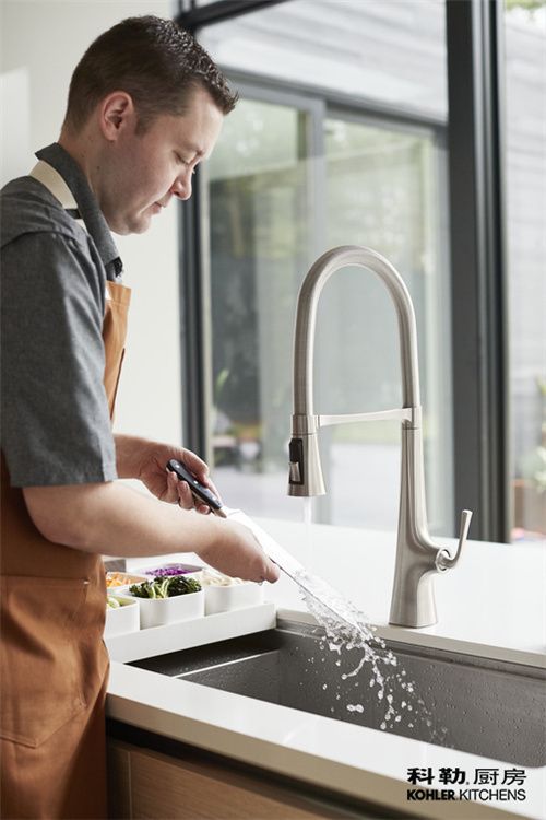 厨房中蔬果厨具和厨盆的清洁是龙头第一大重任,面对多种清洁任务,科勒厨房这款酷思专业厨房龙头有气泡水流,强力水帘和轻柔薄雾三种水型自由切换,轻松应对厨房清洁难题,助你悦享优雅厨趣。