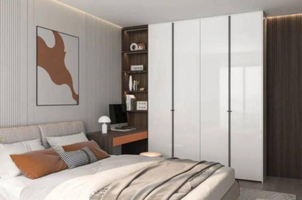 将衣柜最内侧设置为开放格,从开放格延展出一个台面作为工作台,既可以用来办公,也可以代替床头柜的功能,巧妙利用了转角空间,让卧室更显干净整洁。