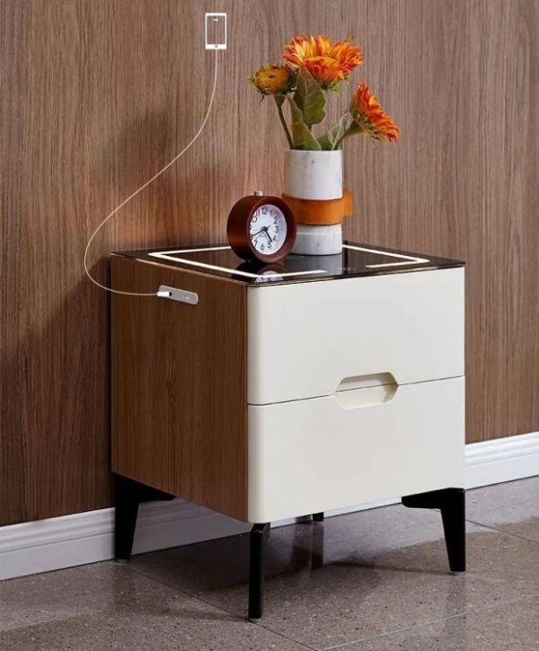 如果对床头柜功能有更多需求的,不如试试智能床头柜。它自带小夜灯功能,不仅可以节约出放置台灯的空间,而且触摸即亮,起夜也不用摸黑。除此之外,它还拥有无线感应充电功能,避免了数据线不够用的困扰。