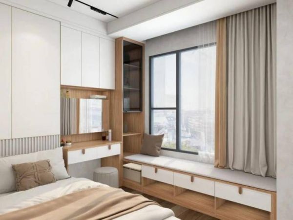 床头定制梳妆台,也能起到代替床头柜的作用。越靠近窗户,化妆时就能拥有更优越、更自然的采光,而且还可以与储物柜、飘窗柜相结合,既节约了空间,又增加了功能性,是非常适合小户型卧室的设计。