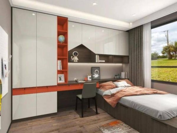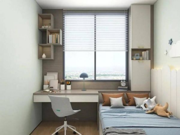 如果卧室横向面积不够,我们还可以竖向利用空间,在床头处设计10cm左右的台面,用来收纳闹钟、睡前读物、小台灯等小物品,方便又顺手,这种设计常常被运用在儿童房里。