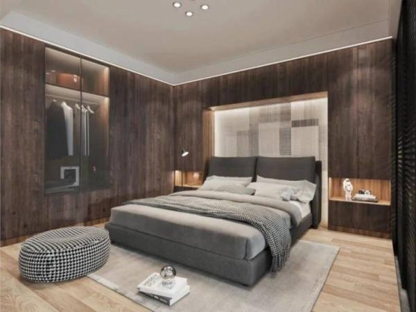 在预算充足的条件下,还可以选择直接在床头背景墙定制收纳柜,内嵌置物格或者定制壁龛,放置常用的物品或者装饰品,它比床头柜的储物能力强很多,但反而不会占据太多空间。