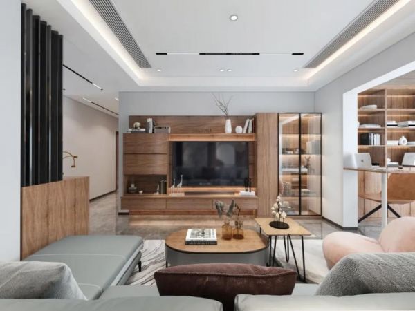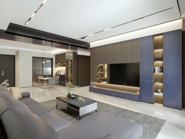 电视柜最常见的留空方式为一字型和点缀型,下方一字型留空,墙面可以预留出各类电线插座的位置,台面还可以放置路由器、音响等影音物品。如果是整墙电视柜,点缀型留空则可以减轻厚重沉闷的视觉观感,还可以摆放美观的工艺品,提升空间质感。