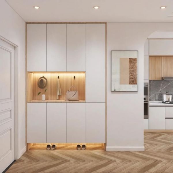 玄关柜常见的留空位置有两处:一是中部留空,方便进出随手放置钥匙、雨伞等小物件;二是底部留空,一蹬一脱即可更换穿着频繁的鞋子,不需要再开柜子拿放,解放双手,更方便快捷,由于是底部留空,柜体还可以遮住鞋子的存在,让进门处空间更显干净整洁。